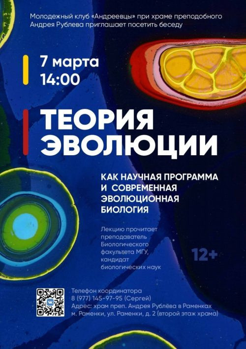 Молодёжный клуб храма преподобного Андрея Рублёва в Раменках приглашает 7 марта в 14 .00 посетить лекцию и беседу на тему «Теория эволюции как научная программа и современная эволюционная биология».