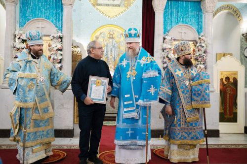 По окончании Божественной литургии архиепископ Ипатий обратился к присутствующим со словами проповеди, в которой рассказал об истории храма и жизни общины, а в заключение владыка Ипатий вручил архиерейские грамоты за усердные труды на благо Церкви директору Центра содействия семейному воспитанию «Наш дом» В. А. Меньшову, клирику храма иерею Александру Досталю, старосте храма Е. М. Грамову и просфорнице О. П. Волковой.