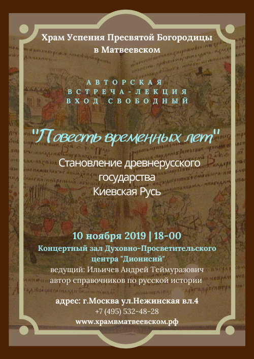 10 ноября 2019 в 18-00 при храме Успения Пресвятой Богородицы в Матвеевском открывается цикл авторских лекций по русской истории. Первая встреча «Повесть временных лет» будет посвящена историческому периоду с IX по XII век. Становление древнерусского государства, создание и распад Киевской Руси. Встречи будут проходить каждое второе воскресенье месяца в 18-00 в концертном зале Духовно-Просветительского центра «Дионисий» на первом этаже Приходского дома.
