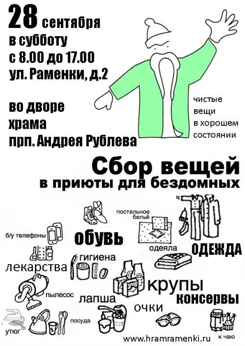 28 сентября во дворе храма преподобного Андрея Рублева будет проходить очередная акция по сбору вещей для бездомных. Акция проводится в партнерстве с ЦСА им. Елизаветы Глинки Департамента социальной защиты населения Москвы.