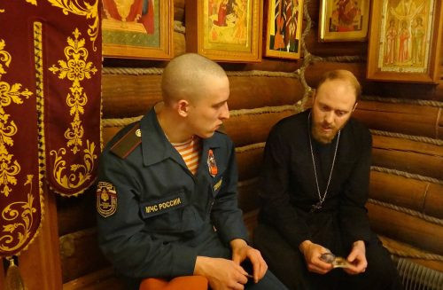 Накануне Крещения рядовой А.С. Горюнов прошел катехизическую беседу с отцом Владимиром, по окончании которой воину-спасателю были вручены православные листовки о Таинствах: крещения, исповеди и причастия, а также буклет о Церкви Христовой.