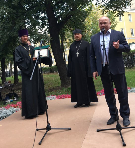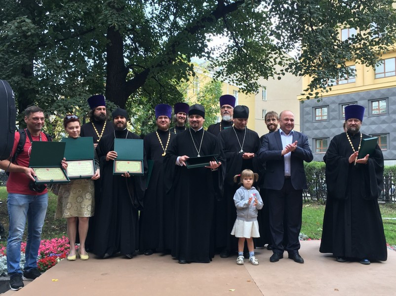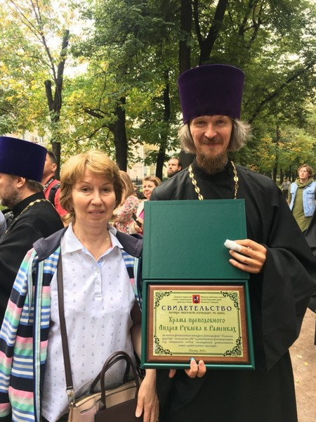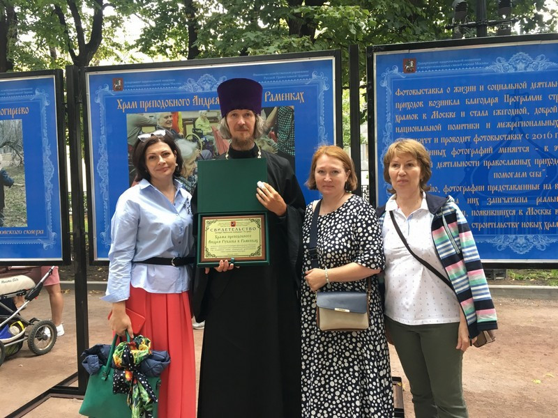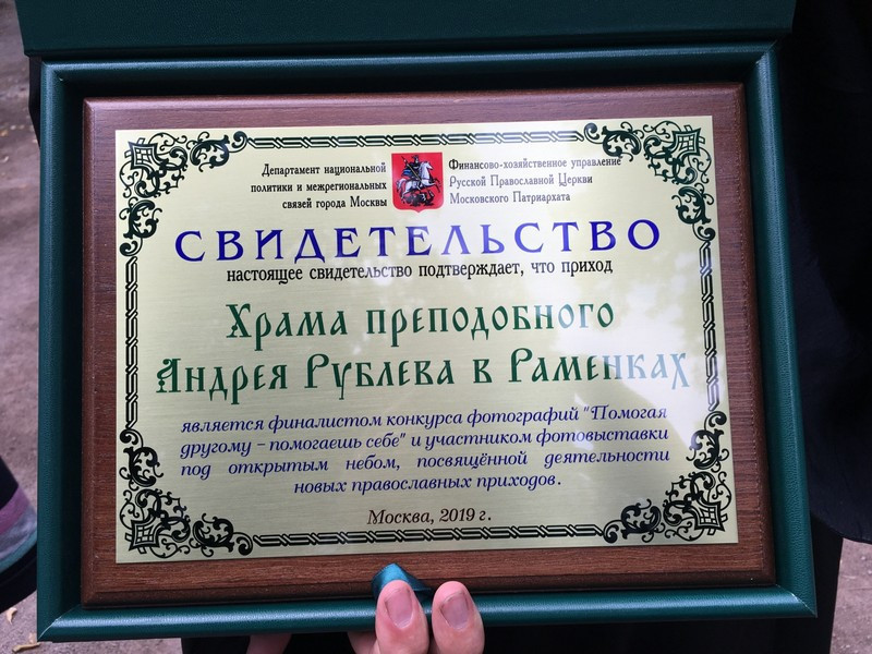 Свидетельство о победе прихода в конкурсе торжественно вручили клирику храма прп. Андрея Рублева священнику Николаю Солодову на открытии фотовыставки, которое состоялось 4 сентября на Гоголевском бульваре, напротив дома 27.