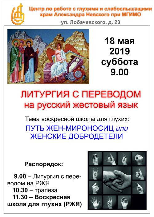 В субботу 18 мая 2019 года состоится заключительный в этом сезоне День Глухих в храме Александра Невского при МГИМО. В этот раз он будет посвящен подвигу святых Жён-Мироносиц. Литургия будет сопровождаться переводом на русский жестовый язык. После трапезы пройдет занятие воскресной школы для глухих, тема которой звучит так: «Путь жен-мироносиц, или Женские добродетели». К приобретению каких качеств характера призывает женщину Священное Писание? Что об этом говорят специалисты по отношениям и семейные консультанты? Об этом и о многом другом пойдет речь на занятии воскресной школы для глухих. Милости просим! Справки по телефону: 8-926-456-97-57 Дополнительно: