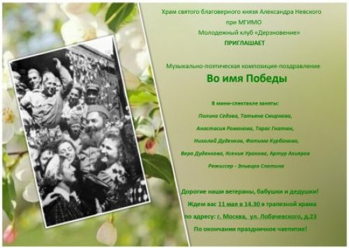 11 мая Молодежный клуб «Дерзновение» храма Александра Невского покажет музыкально-поэтическую композицию «Во имя Победы». После спектакля состоится чаепитие, организованное силами прихода. Дорогие наши ветераны, бабушки и дедушки! А также все те, кто хочет поздравить наших ветеранов! Ждем вас 11 мая в 14.30 в трапезной храма. Дополнительно: