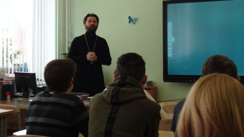 «Кто на войне не бывал, то Богу не маливался», — такими словами начал свой рассказ прот. Вадим Поликопа клирик храма в честь Смоленской иконы Божией Матери в Фили-Давыдково в ГБОУ «Школа №1248». Урок для старшеклассников условно был разделен на две части: в первой батюшка рассказал школьникам о предпосылках войны, о безбожной власти и о безграничной помощи со стороны Церкви в те суровые годы. Помимо этого было рассказано о непосредственной помощи нашему народу от святых заступников земли русской. Была упомянута легендарная «дорога жизни» — Ладожское озеро.