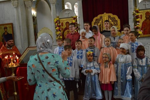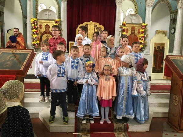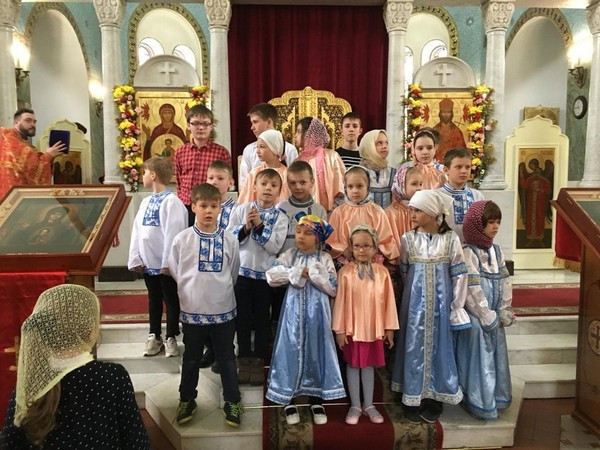Ребята исполнили пасхальные песнопения, рассказали стихи и поздравили прихожан со светлым праздником Воскресения Христова.