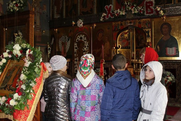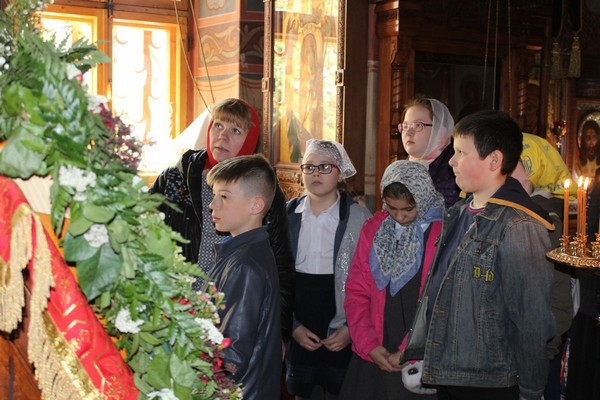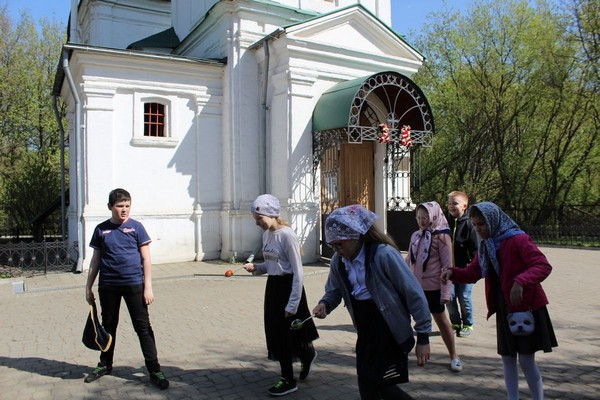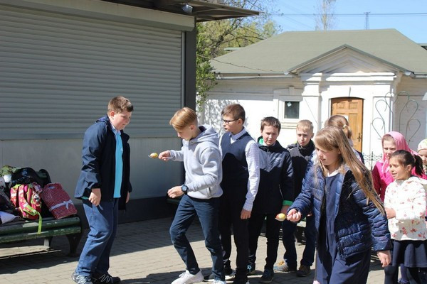 Сотрудники храма предложили младшим школьникам поиграть в «пасхально-спортивные» игры. С большим азартом дети участвовали в эстафетах с расписанными деревянными яйцами. Кадетам и старшеклассникам провели краеведческую экскурсию и рассказали о храме. Старшеклассникам понравилась игра с вареными крашеными яйцами – обмен яйцами. А кадеты с удовольствием «бились» на яйцах со своим воспитателем Тишковым Федором Александровичем перед чаепитием с куличами. Оказалось, что некоторые из них уже были на экскурсии в нашем храме в четвертом классе.