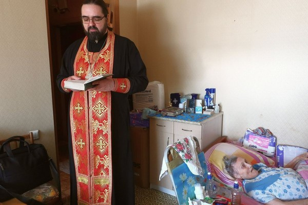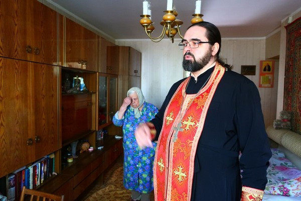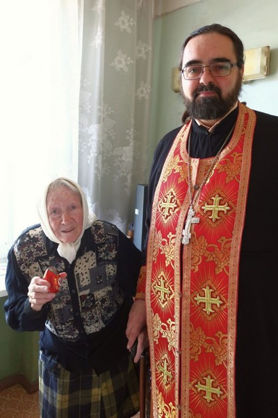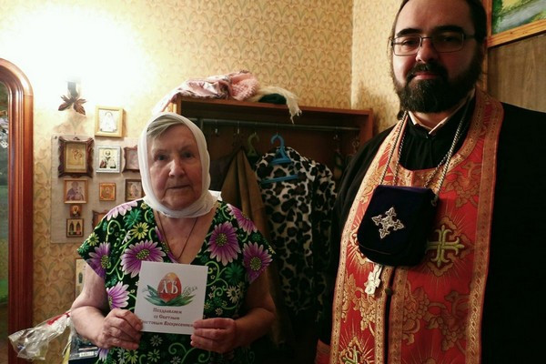 В Светлый понедельник, 29 апреля, клирик храма святого великомученика Георгия Победоносца на Поклонной горе священник Дионисий Лукин в сопровождении волонтера службы социальной помощи «Милосердие» Марии Иконниковой посетил на дому подопечных «Милосердия», проживающих на территории Западного викариатства.