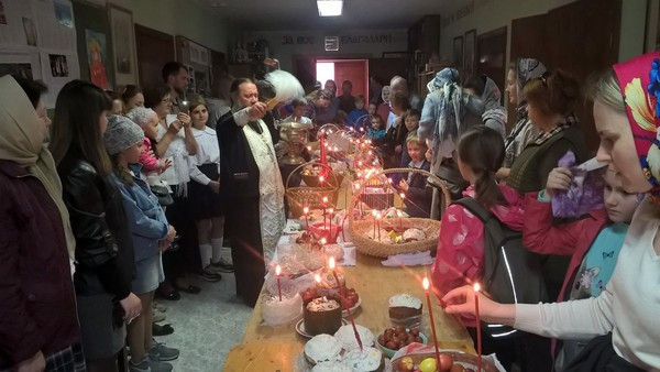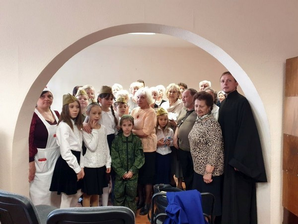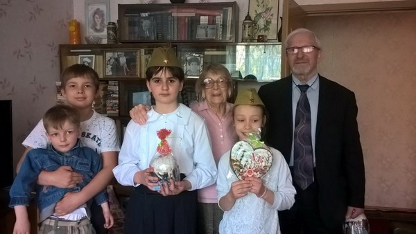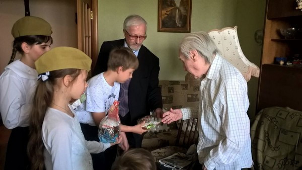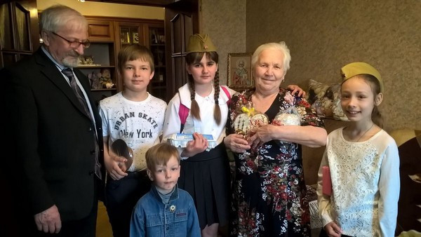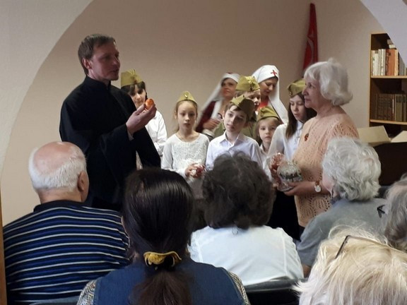 По окончании представления старший преподаватель Воскресной школы д. Андрей К. рассказал о смысле Воскресения Христова и вручил вместе с ребятами освященные куличи и яйца. По благословению настоятеля храма протоиерея Георгия Студенова для каждого ветерана от храма, также был организован специальный подарок-пряник с поздравлением Светлого Христова Воскресения и праздником Победы.