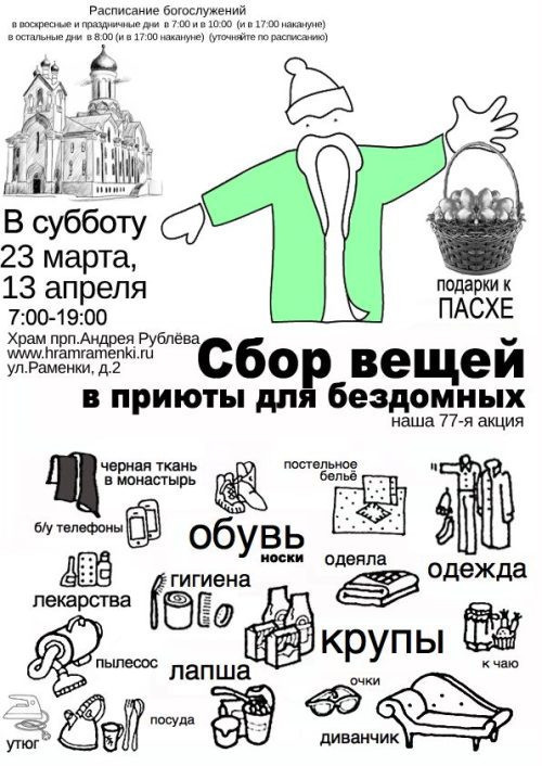 23 марта, в субботу, c 7:00 до 19:00 на территории храма будет проходить 77-я акция по сбору вещей в приюты для бездомных и других нуждающихся.