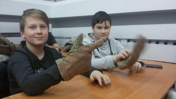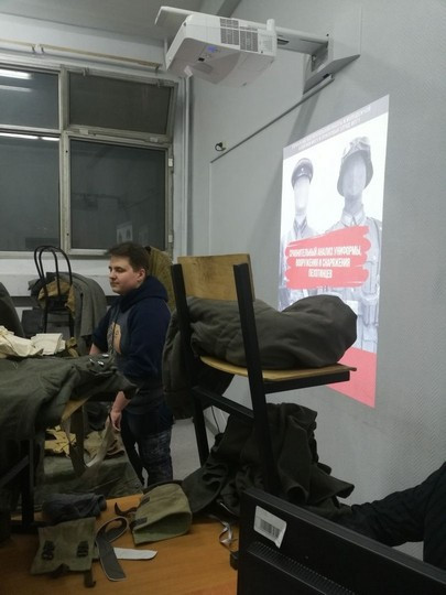 Поисковик Антон Райков рассказал участникам об отличиях деталей формы времен Великой Отечественной войны 1941 – 1945 гг. военных противоборствующих сторон на действительных примерах, выкопанных на военных археологических экспедициях.