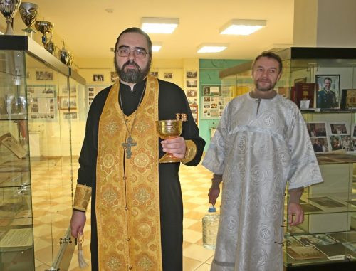 Перед началом освящения батюшка отслужил краткий молебен с особыми прошениями «о зде начальствующих, учащих и учащихся», после чего с пением тропаря Праздника Богоявления окропил Крещенской водой помещения всех четырёх этажей школы.