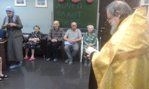 В рамках достигнутой с администрацией договоренности раз в месяц клирик храма св. вмч. Георгия Победоносца Патриаршего Подворья на Поклонной горе г. Москвы посещает людей, проживающих в учреждении.