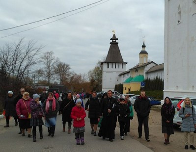 По прибытии в монастырь все первым делом пошли на богослужение, как раз начиналась поздняя Литургия, за которой участники поездки вознесли свои молитвы о живых и усопших, поблагодарили Господа за многие Его милости к нам. По окончании богослужения паломники приложились к раке, расположенной над местом захоронения основателя монастыря — прп. Пафнутия.