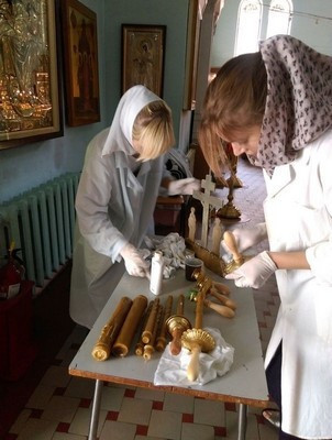 Ребята помогали в алтаре, помыли окна, а девушки чистили подсвечники и алтарную утварь. Отец Иоанн провел своего рода мастер-класс по чистке церковной утвари, показал основные секреты того, как содержать все в чистоте и порядке.