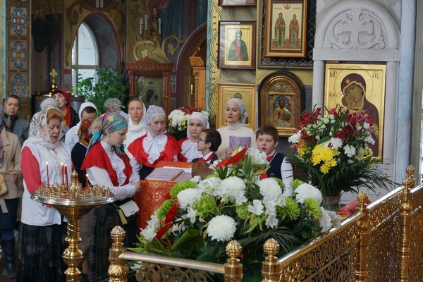 За Божественной Литургией пели: хор храма вмч. Георгия Победоносца Патриаршего Подворья на Поклонной горе (регент Деревенец А.) и детский хор Воскресной школы № 25 «Родник» храма Рождества Пресвятой Богородицы в Крылатском (регент Петяева Н.).