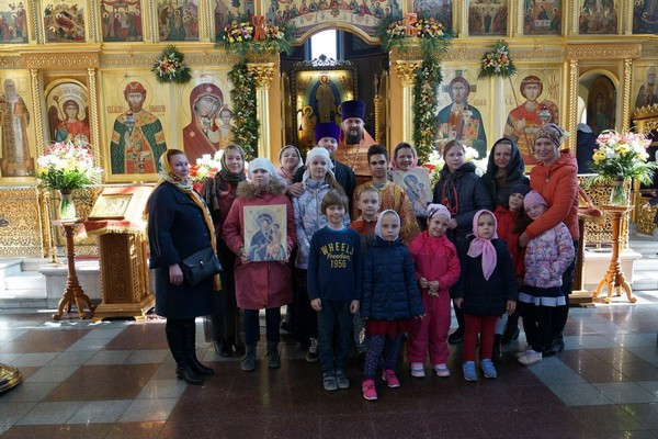 После общей памятной фотографии на ступенях храма, детей и взрослых пригласили выпить горячего чаю со сладостями в стенах Воскресной школы «Росток».