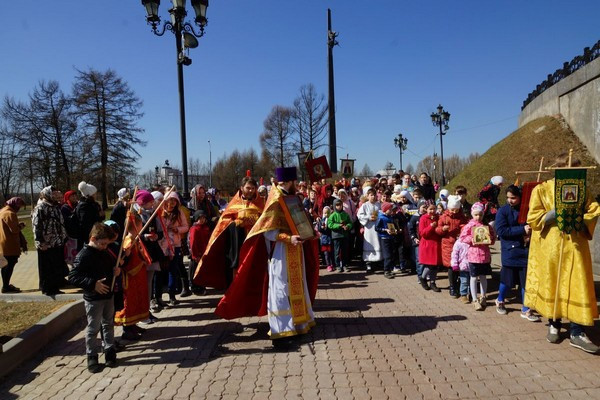По окончании Литургии состоялся последний, в текущем году, пасхальный Крестный ход. Для юных участников Крестного хода были заранее заготовлены детские хоругви, фонарики и маленькие иконы.