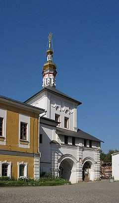 Надвратная церковь Толгской иконы Божией Матери была выстроена в 1733 году при игумене Варлааме. В 1768 году церковь отошла в приход села Сабурова, т.е. была приходской, а в начале Х I Х века вновь стала монастырской. В 1785-1786 гг. храм был оштукатурен и впервые расписан. В 1869 году по благословению Высокопреосвященного Иннокентия, митрополита Московского церковь была обновлена устройством нового престола и жертвенника, позолоченного шестиярусного иконостаса, стенною живописью и поновлением икон. Под церковью находилось сначала двое ворот. Одни из них, названные «водяными» (отсюда ходили за водой на Москва-реку) и построенные в конце 17-го века, сохранились до сего времени. Другие были заложены, и таким образом получилась палатка, в которую, по свидетельству начала 19-го века, клали покойников. Запись 1806 года говорит, что Толгская церковь была выкрашена в красный цвет. Это подтверждают и свидетельства начала 20-го века.