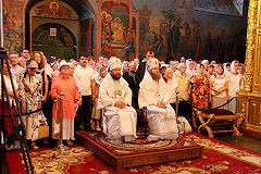 Прежде всего, хотел бы передать всем вам благословение Святейшего Патриарха Московского и всея Руси Кирилла, который в этот день находится в Соловецком Преображенском монастыре, совершая Божественную литургию в честь этого великого праздника.