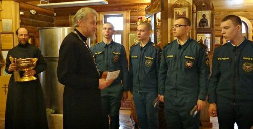21 января, солдаты-срочники посетили храм Св.вмч.Геогрия Победоносца при МЧС. В Доме Божием воины поставили свечки к праздничной иконе «Крещение Господне», а также подали записки о здравии и упокоении на Богослужение. Настоятель храма прот.Леонид Олейников поздравил огнеборцев с торжеством, произнес слова назидания приминительно к военной службе спасателей и окропил их Великой Агиасмой. Помимо этого срочникам были вручены символические подарки от детей прихода — рисунки и шоколад.