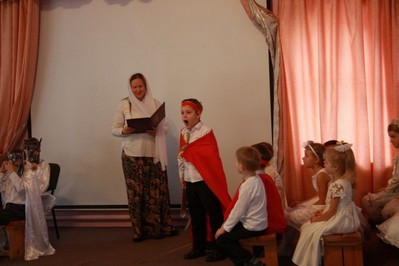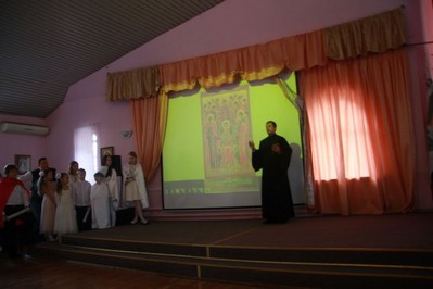 Праздник воспитанников 1-4-х классов Воскресной школы также открылся поздравлением старшего преподавателя, которого сменили сценка театрального кружка «Революция на небесах».