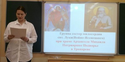 Воскресную школу при храме Архистратига Михаила (Патриаршее подворье) в Тропареве на секции 3 «Моя помощь ближнему» представляла сестра милосердия им. свт. Луки (Войно-Ясенецкого) Семенченко Наталья, которая выступила с сообщением «Опыт сестер милосердия при Воскресной школе». В своем сообщении Наталья рассказала об идее создания группы сестер милосердия и поделилась опытом и впечатлениями о своей деятельности.