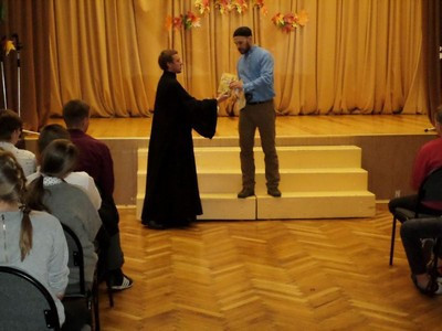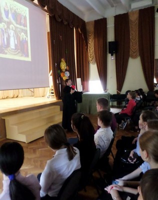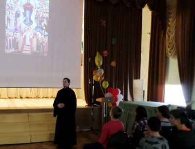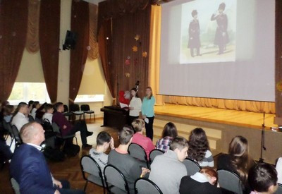 Вначале встречи представитель Русской Православной Церкви рассказал собравшимся учащимся о сути и смысле праздника Покрова Божией Матери. Затем, девушки-студентки Института истории и политики исторического факультета МПГУ Пинчукова Ирина, Меркулова Анна и Концевая Юлия представили краткую историю казачества и провели Викторину.