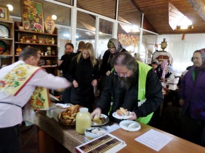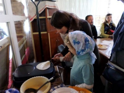 Всех именинников д. Андрей одаривал выпечкой своими руками и приглашал принять участие в выпечке своего собственного блина. Т.е. каждый желающий мог подойти к плите, где мог себе испечь блин!