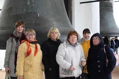 Учителя поднялись на знаменитую Ростовскую звонницу, где до нашего времени сохранились старинные колокола. Если бы ее не было, вряд ли можно было бы говорить сейчас о возрождении колокольных звонов. Стоит заметить, что подбор колоколов в храме святителя Димитрия Ростовского в Очакове в основном соответствует подбору колоколов звонницы Ростовского кремля.