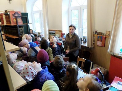 На встрече с библиотекарем храма, старший преподаватель школы диакон Андрей К. зачитал поздравительное стихотворение с благодарностью за труд библиотекаря, после чего Евгения Васильевна поведала экскурсантам о работе библиотеки при храме, рассказала о находящейся в ней литературе, показала стеллажи с книгами и пригласила гостей стать активными читателями того «духовного богатства», что наполняет книги полок.