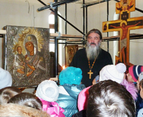 По четвергам, практически еженедельно, в наш храм в гости к батюшке приходит класс в сопровождении учителей, а иногда и родителей. Сначала отец Валерий ведёт ребят на экскурсию в верхний храм, где рассказывает о его устройстве и о главных святынях — Иверской иконе Божией Матери и старинной, обновляющейся на глазах у прихожан, иконе Божией Матери «Троеручица». Рассказ о них напрямую связан с ересью иконоборчества, и батюшка слышит подчас от своих юных гостей возмущённые возгласы, вроде: «Да надо было всех этих иконоборцев из гранатомёта…»