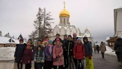 Первым делом отправились в собор Рождества Богородицы, где помолились и приложились к мощам Преподобного Саввы, Звенигородского Чудотворца, основателя обители, одного из первых учеников преподобного Сергия Радонежского. Монастырь расположен на высоком берегу реки Москвы на горе Сторожа и был основан в 1398 году по просьбе Звенигородского князя Юрия Дмитриевича, 2го сына великого Московского князя Димитрия Донского. Дети помолились на литургии, и кто готовился причастились. Потом в монастырской трапезной быстро попили чай с вкусными пирожками и отправились на экскурсию. Экскурсовод интересно рассказала об истории монастыря и житие преподобного Саввы Сторожевского. Мальчикам и девочкам особенно запомнилось чудесное заступничество Чудотворца и спасение царя Алексея Михайловича на охоте от лютого медведя. После чего царь избрал монастырь своей резиденцией, и был сооружён Дворец (палаты царя Алексея Михайловича) для богомольных выходов в монастырь. А для супруги царя, Марии Ильиничны Милославской, были построены Царицыны палаты, которые соединялись переходом с соседней надвратной церковью Живоначальной Троицы, в которой побывали наши паломники. Здесь все помолились и приложились к иконам и к мощевикам с частицами мощей святых. От экскурсовода дети узнали о чудесном явлении преподобного Саввы во время Отечественной войны 1812 года командиру французской армии, приёмному сыну Наполеона, Евгению Богарне. Преподобный повелел не разорять монастырь и обещал принцу возвращение живым на Родину. Также всем была интересна история святых мощей преподобного Саввы. Во время царствования Алексея Михайловича произошло обретение честных мощей преподобного Саввы Сторожевского 19 января (1 февраля по новому стилю) в 1652 году. После революции в 1919 году монастырь был закрыт, а мощи были конфискованы и увезены на Лубянку. Долгое время считалось, что святые мощи утрачены, но честная Глава преподобного Саввы тайно хранилась в семье верующих. В 1985 году святыня была передана в Московский Свято-Данилов монастырь, а в 1995 Саввино-Сторожевский монастырь был возрождён, и во время празднования 600-летия обители в 1998 году Святейший Патриарх Алексий II торжественно перевёз в него мощи преподобного Саввы.