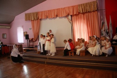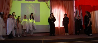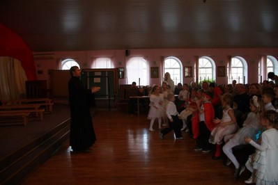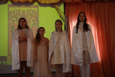 Праздник воспитанников 1-4-х классов Воскресной школы также открылся поздравлением старшего преподавателя, которого сменили сценка театрального кружка и театрализованная композиция «Херувим» студентов и преподавателей Культурно-просветительского центра МТУСИ (Московский технический университет связи и информатики).