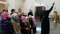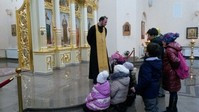 Священник Роман Граничников рассказал ребятам об устройстве храма и символическом значении его архитектурных частей, показал через Царские врата убранство алтаря и пояснил использование на Литургии различных богослужебных предметов. В конце экскурсии о. Роман поднялся вместе с детьми на клирос и обходную галерею, дав возможность полюбоваться на интерьер с высоты.