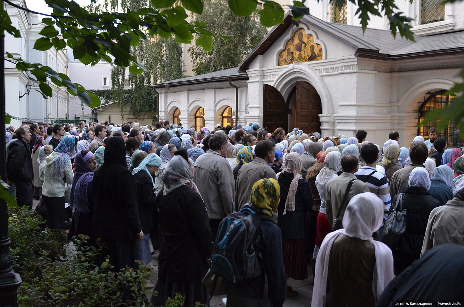 На время особо многолюдного богослужения галерея на стилобате становится алтарем, – здесь устанавливается переносной Престол, – а прихожане располагаются в монастырском дворе.