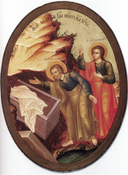 Апостолы Петр и Иоанн у Гроба Господа нашего Иисуса Христа Сегодняшнее Евангелие говорит нам о том, что апостолы, жены-мироносицы, которым Господь много-много раз прямо говорил о Своем Воскресении, увидев пустой Гроб, даже не задумались об этом. Это напоминает нам и о нашем с вами неверии, какими бы верующими мы сами себя ни считали.