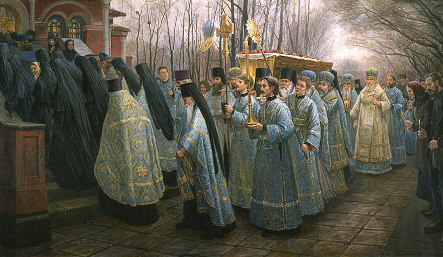 Перенесение мощей патриарха Тихона или Благовещение в Донском монастыре (худ. Ф.А. Москвитин) Около месяца назад один из старцев на вопрос о том, как сейчас можно помочь Церкви, ответил, что не человеческими силами и не нашими слабыми возможностями это совершится. Господь воздвигнет силу Свою и «приидет во еже спасти ны». И если Господу было угодно воздвигнуть в помощь земной Воинствующей Церкви святителя Тихона, то, значит, недалек для нас час испытаний, но близка и помощь Божия.