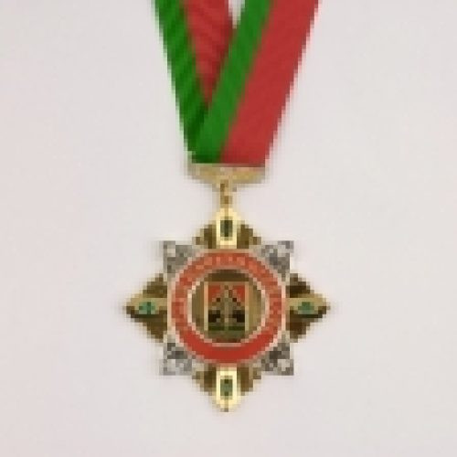 Знак при помощи серебряного ушка крепится на муаровую ленту с продольными полосами красного и зеленого цветов.