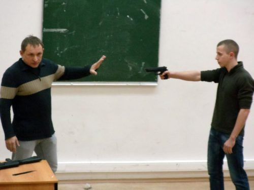 По окончании краткой лекции-беседы, со студенчеством пообщался и показал мастер-класс по нескольким фрагментам самообороны, инструктор центра русского рукопашного боя им. А.В. Суворова Степан Николаевич и его помощник Никита.