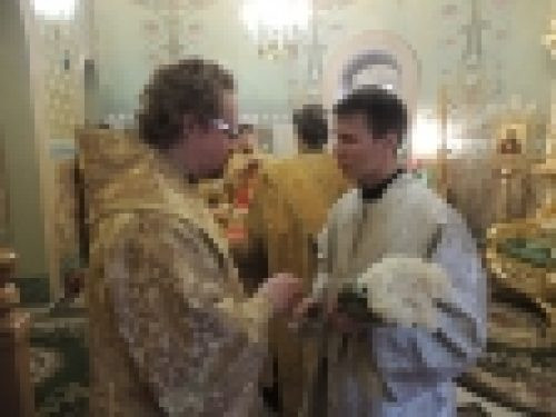 За Литургией епископ Игнатий совершил диаконскую хиротония, в сан диакона рукоположен иподиакон храма Иконы Божьей Матери «Неувядаемый цвет» Павел Колокольцев.