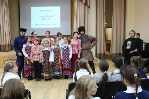 Вначале встречи представитель Русской Православной Церкви рассказал ребятам о празднике и истории казачества, где были показаны кадры из фильмов и фотографии, посвященные казачеству. После исторического экскурса фольклорный ансамбль «Ластовка» из детской школы искусств «Вдохновение» исполнил несколько казачьих песен.