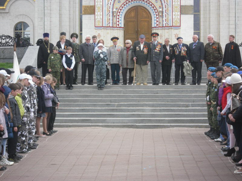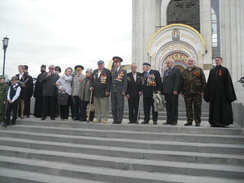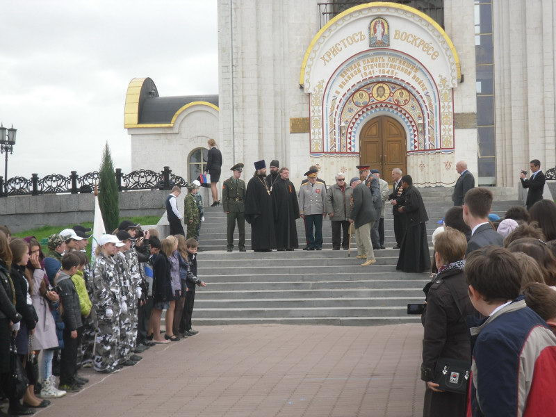В этом году после успешной презентации этой разработки на окружном и городском семинарах к нам присоединились школы района Раменки, поэтому было принято решение провести финальное мероприятие на Поклонной горе, на площади перед храмом великомученика Георгия Победоносца. В одном строю со школьниками традиционно стояли наши друзья из оборонно-спортивного клуба «Ратник» и военнослужащие академии Генштаба.