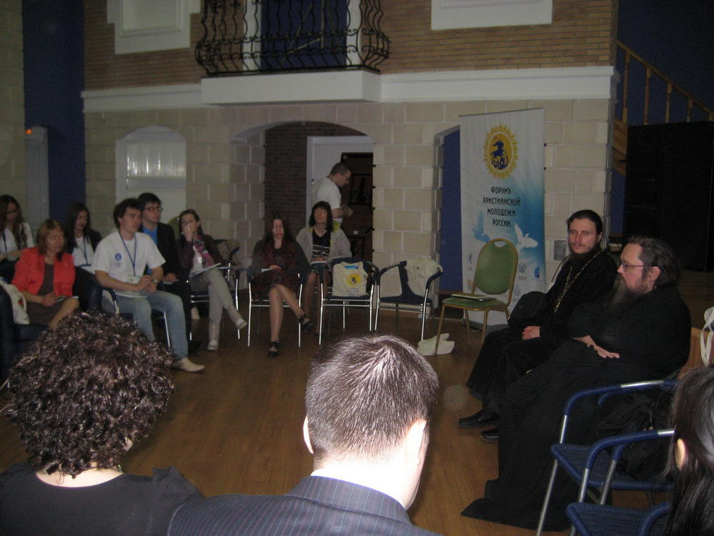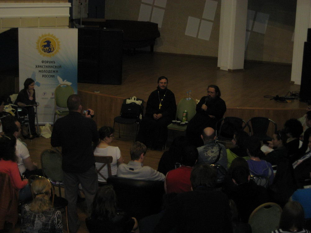 На территории базы отдыха «Бекасово» под Москвой, христианская молодежь пообщалась с иеромонахом Димитрием (Першиным) и протодиаконом Андреем Кураевым.