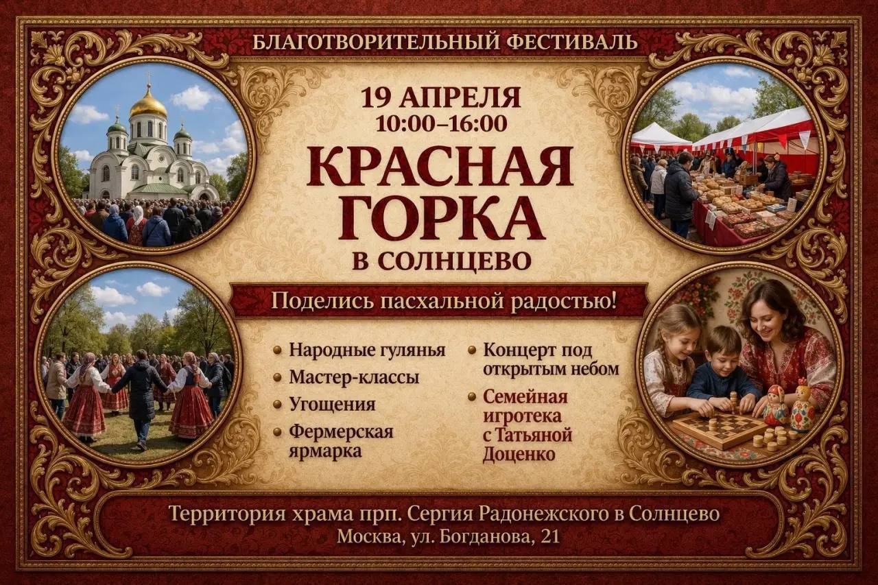 19 апреля 2026 года, на территории храма прп. Сергия Радонежского в Солнцево пройдут большие пасхальные гуляния. Праздник который объединит в себе два праздничных события – благотворительный фестиваль «Красная горка» и городской фестиваль «Пасхальный дар» при поддержке Правительства Москвы.