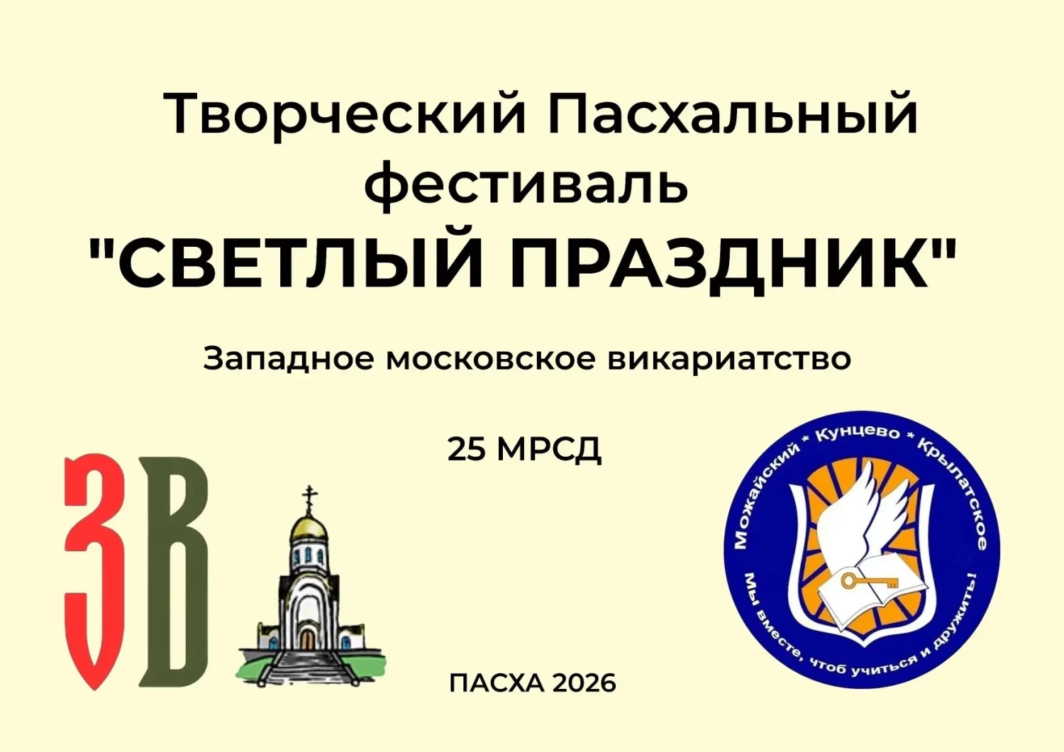 Совет по духовно-нравственному воспитанию Западного викариатства и 25 межрайонных советов директоров.при информационной поддержке Института содержания, методов и технологий образования МГПУ проводит творческий Пасхальный фестиваль «СВЕТЛЫЙ ПРАЗДНИК». Он состоится 24 апреля в КЦ «Рублево», начало в 11:00.